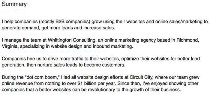 As you can see in Rick’s example, he leads with the core purpose of his business, which is to help his customer grow their businesses using their websites. Then he expands on what he does on a day-to-day basis and finishes with a notable example from his work history that provides a case study for the value he provides. When writing your profile, aim for a short statement that identifies the value you bring to the table and an understanding of how you arrived where you are now.